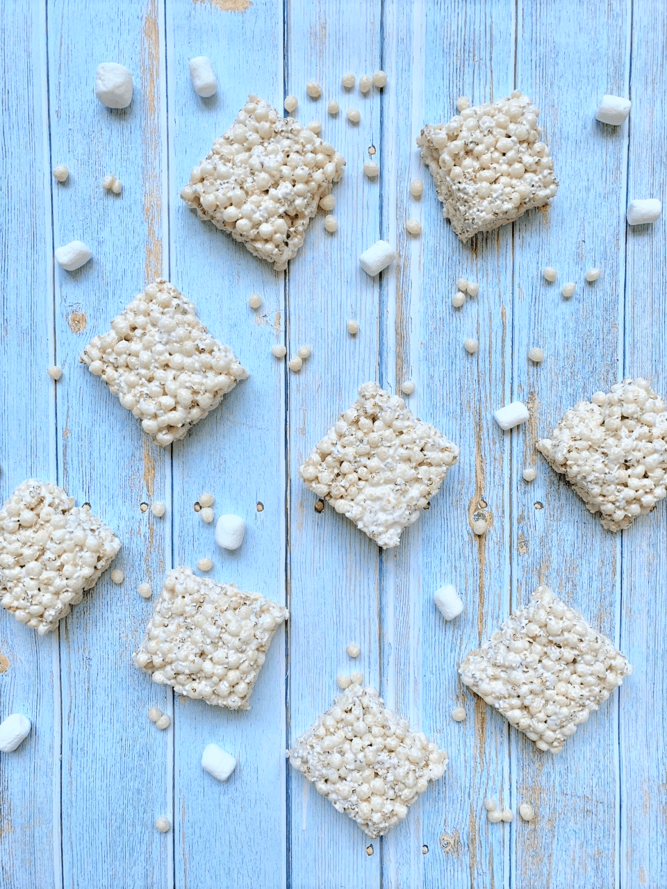 Rather than making them out of Rice Krispies, I decided to use a blend of puffed quinoa cereal and puffed amaranth. Puffed quinoa is not only nutritious, but it puffs up beautifully, creating a similar airy/crunchy texture and nutty flavor. In fact, Talya enjoys snacking on them even when they’re, “au natural.”